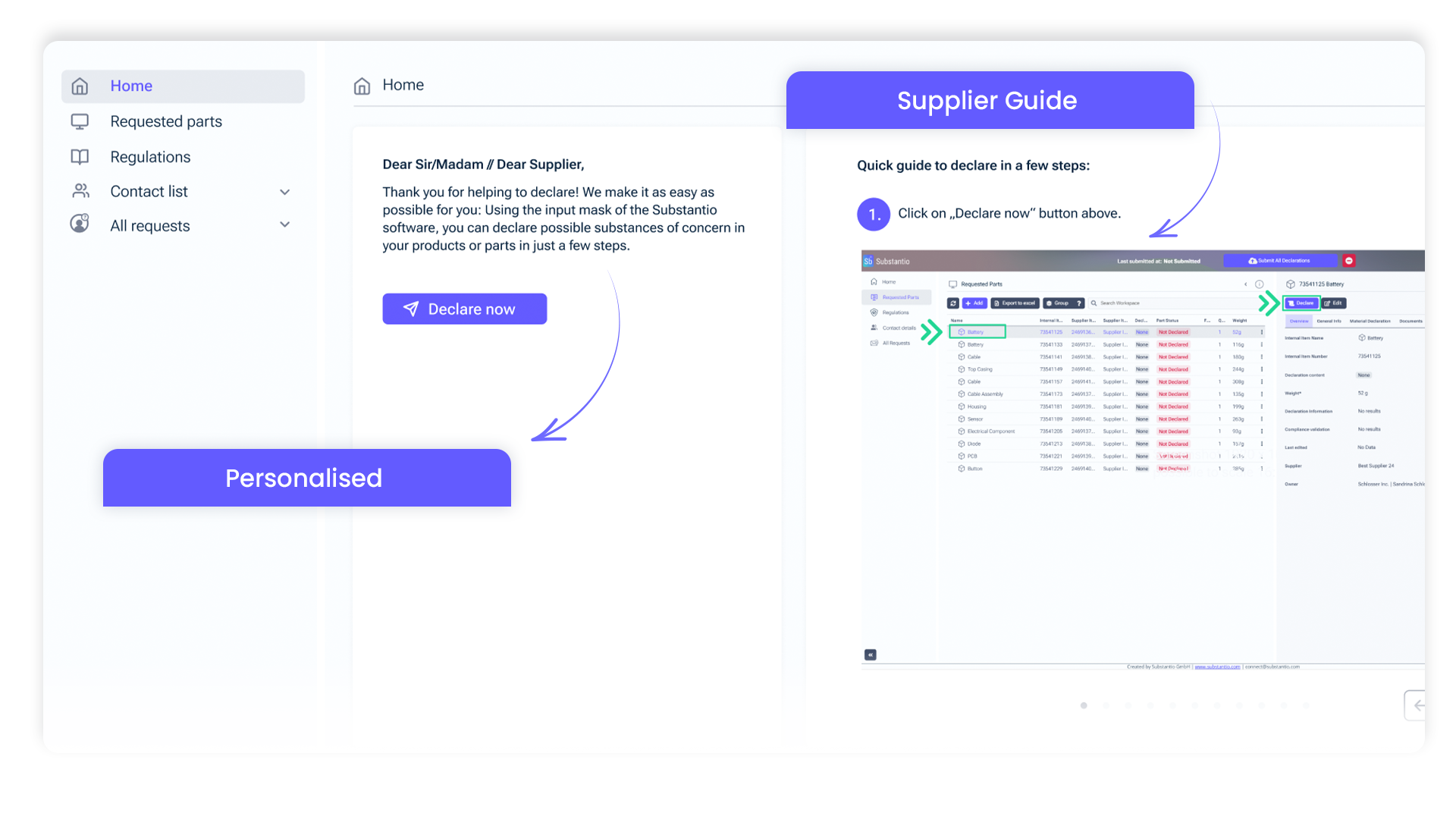 To comply with legal requirements, you rely on material data from your suppliers. To ensure you receive as much data as possible for declarations, we make the declaration process clear and user-friendly for your suppliers.