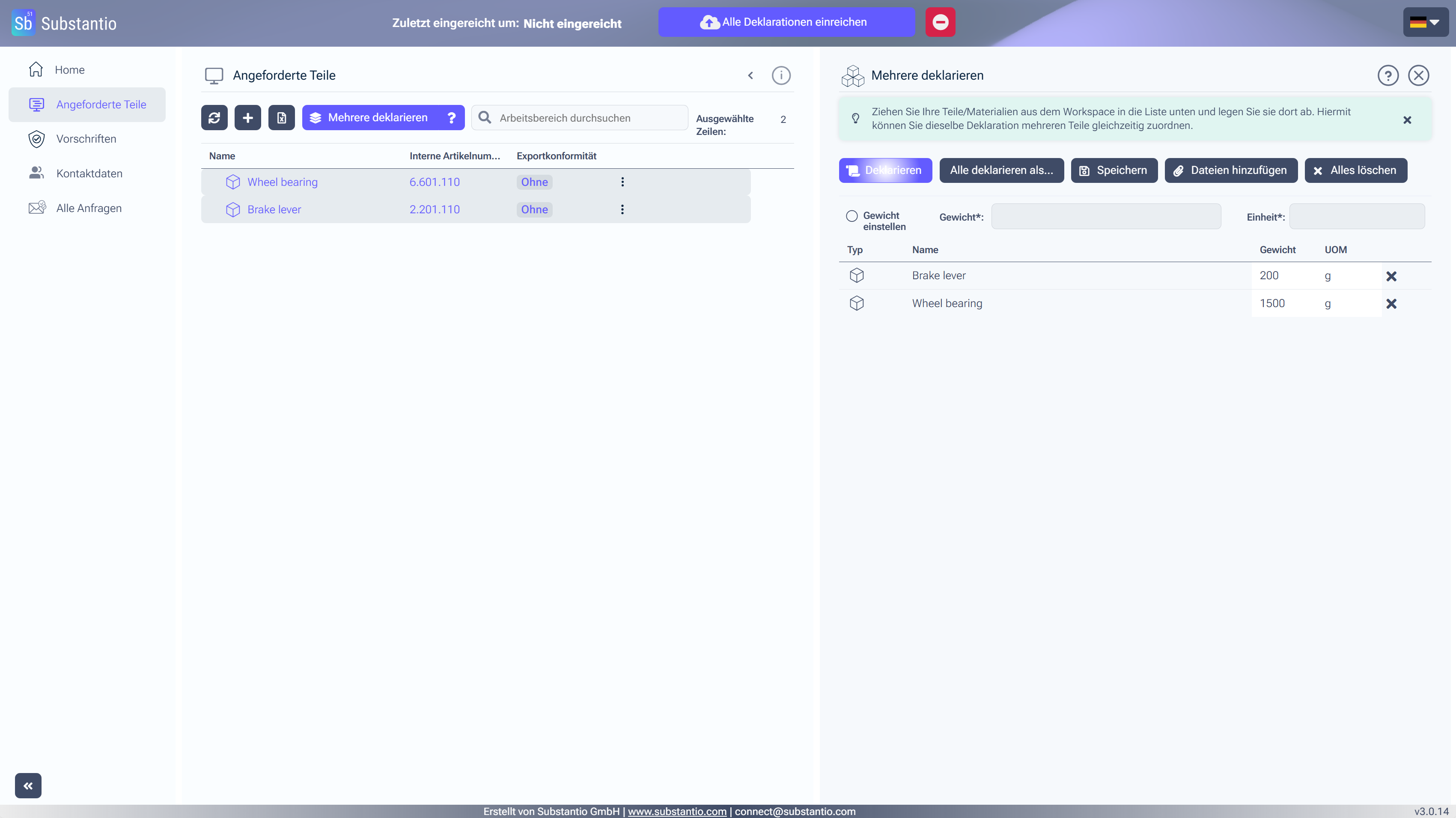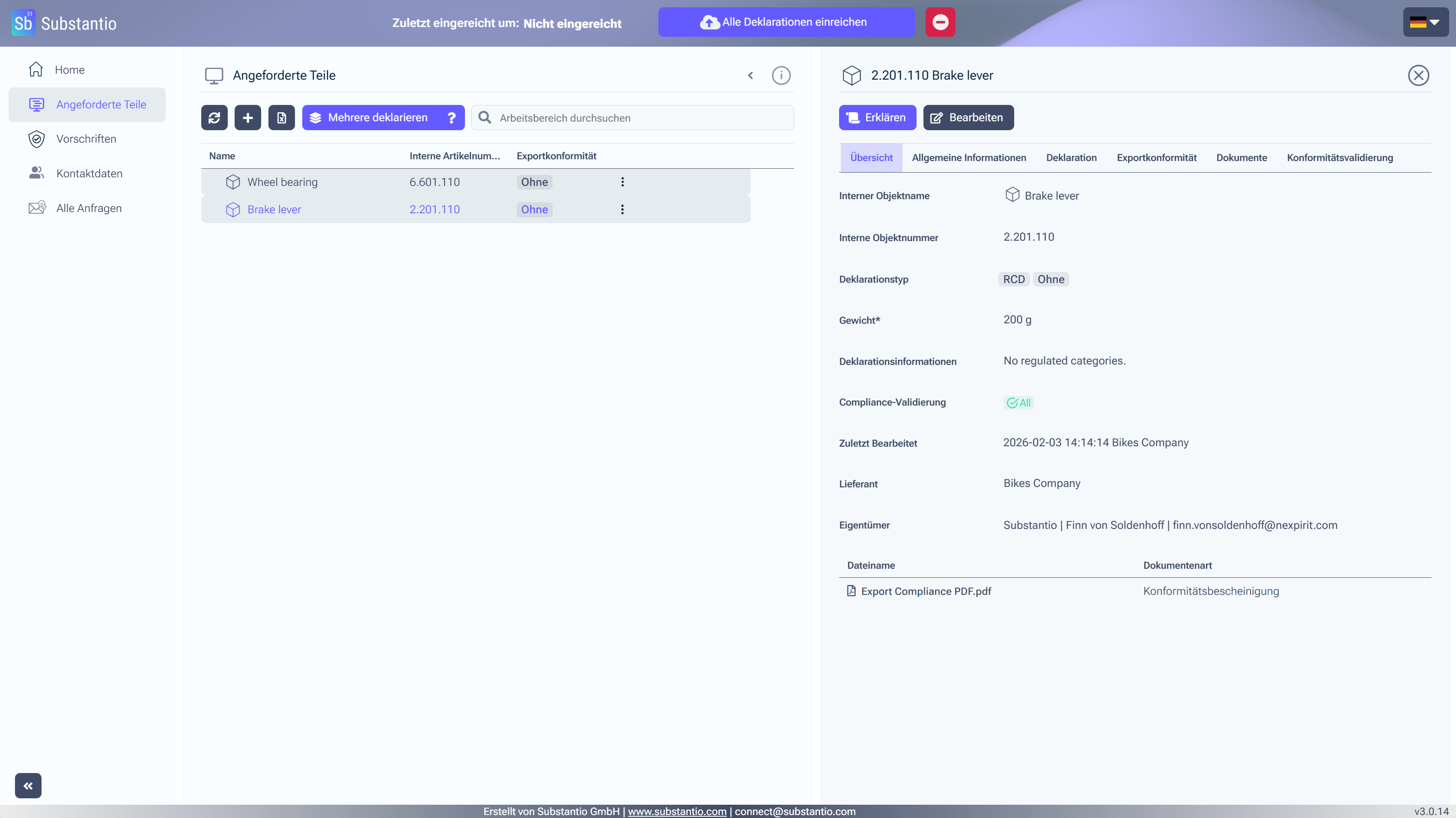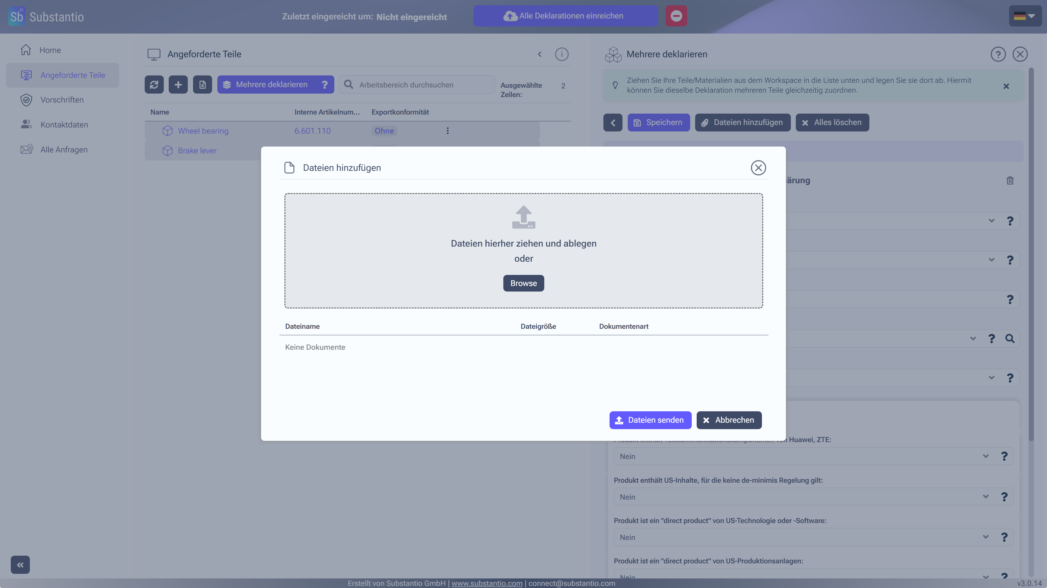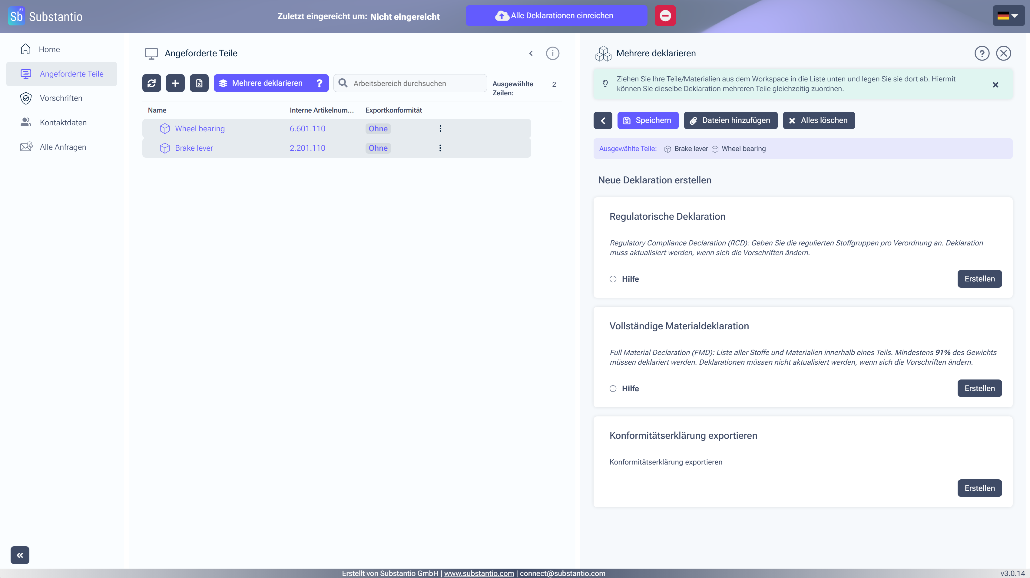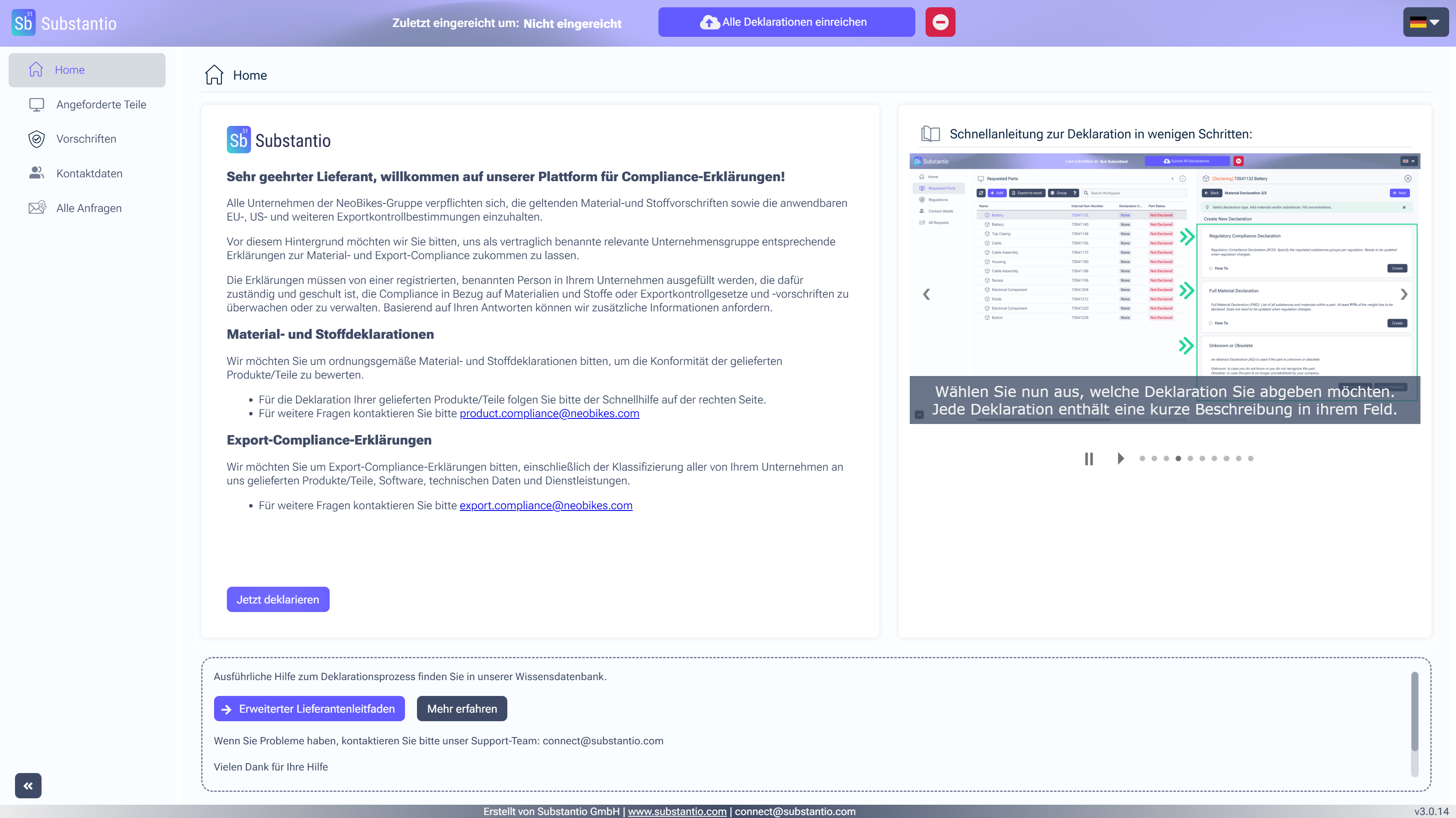 Über den Link in der E-Mail Ihres Kunden gelangen Sie zur Substantio-Plattform. Um die Anfragen Ihres Kunden zu bearbeiten, klicken Sie auf Jetzt deklarieren.