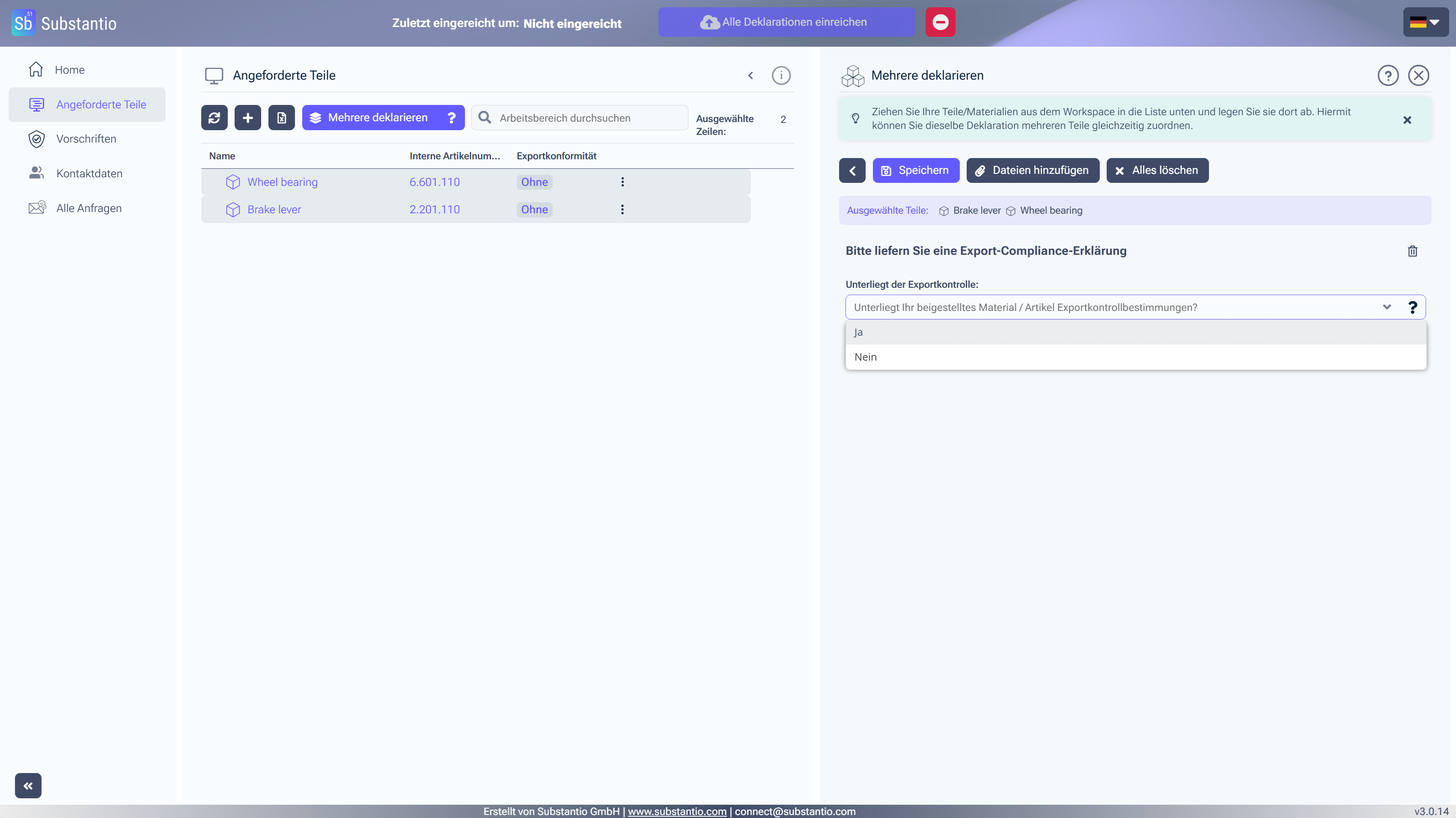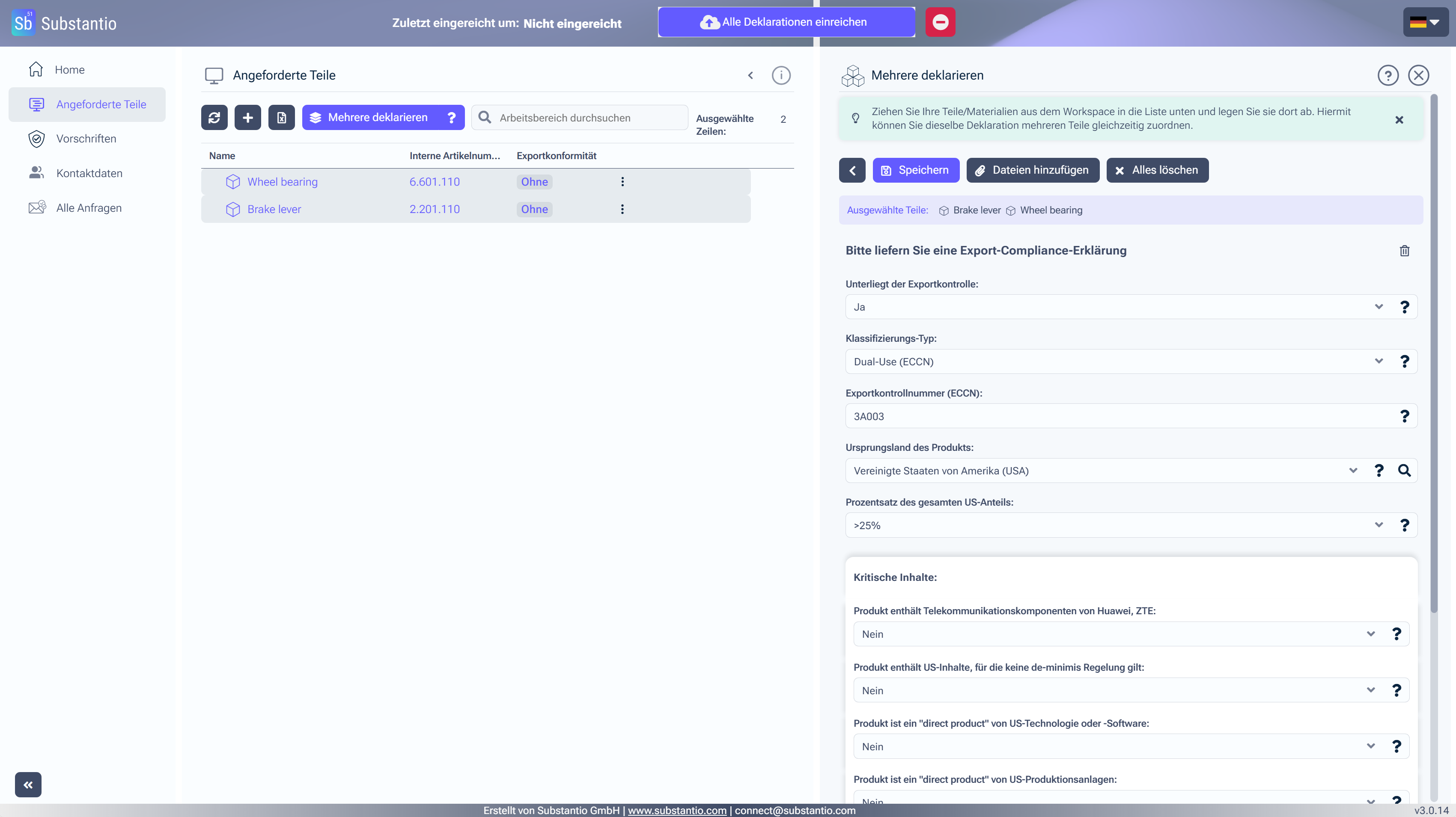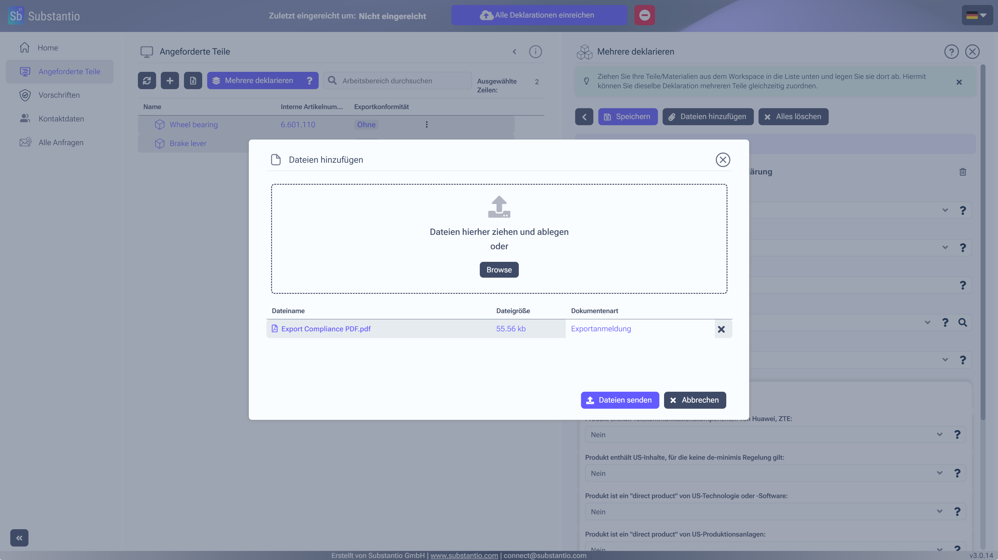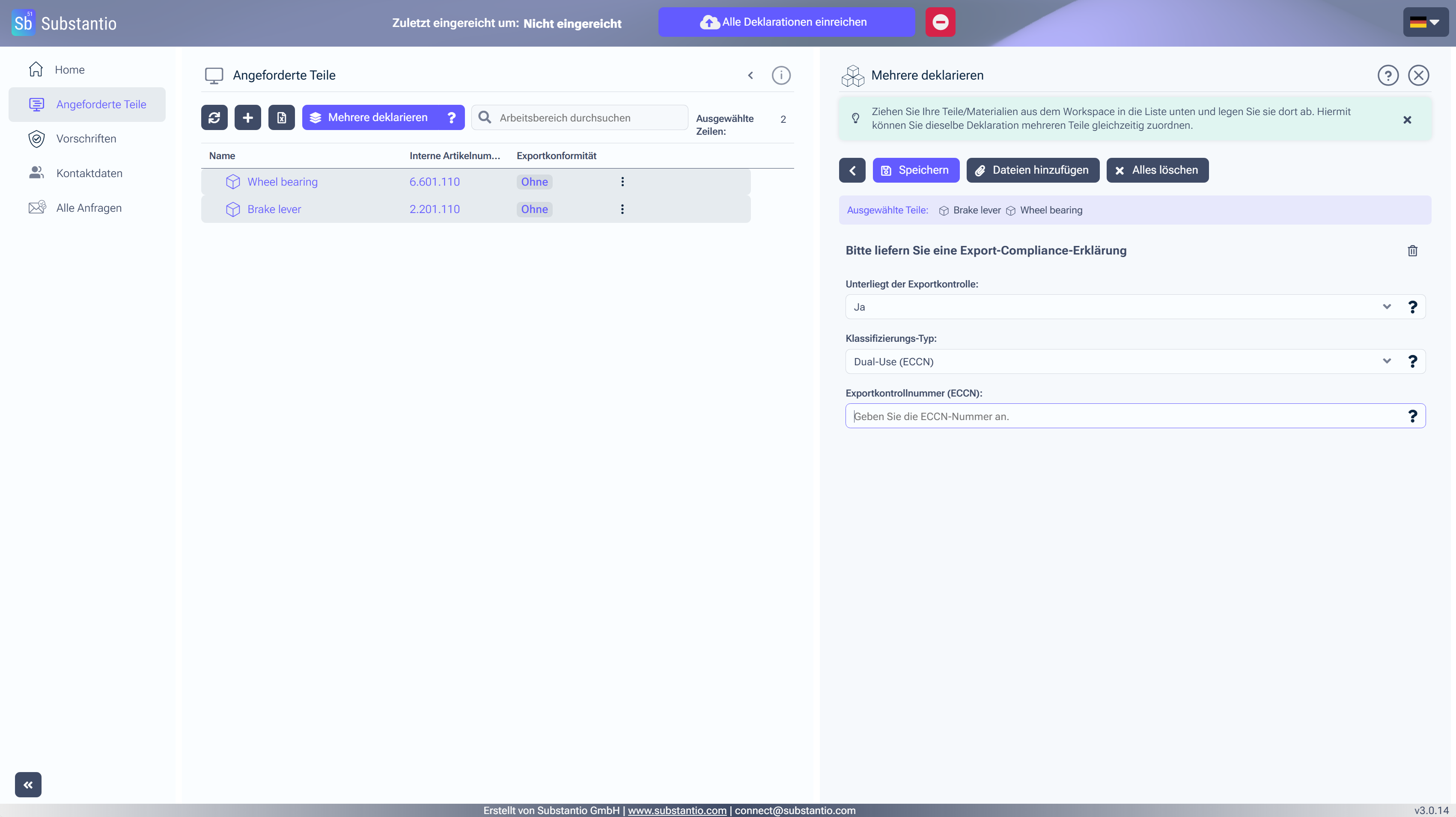 Über den Link in der E-Mail Ihres Kunden gelangen Sie zur Substantio-Plattform. Um die Anfragen Ihres Kunden zu bearbeiten, klicken Sie auf Jetzt deklarieren.