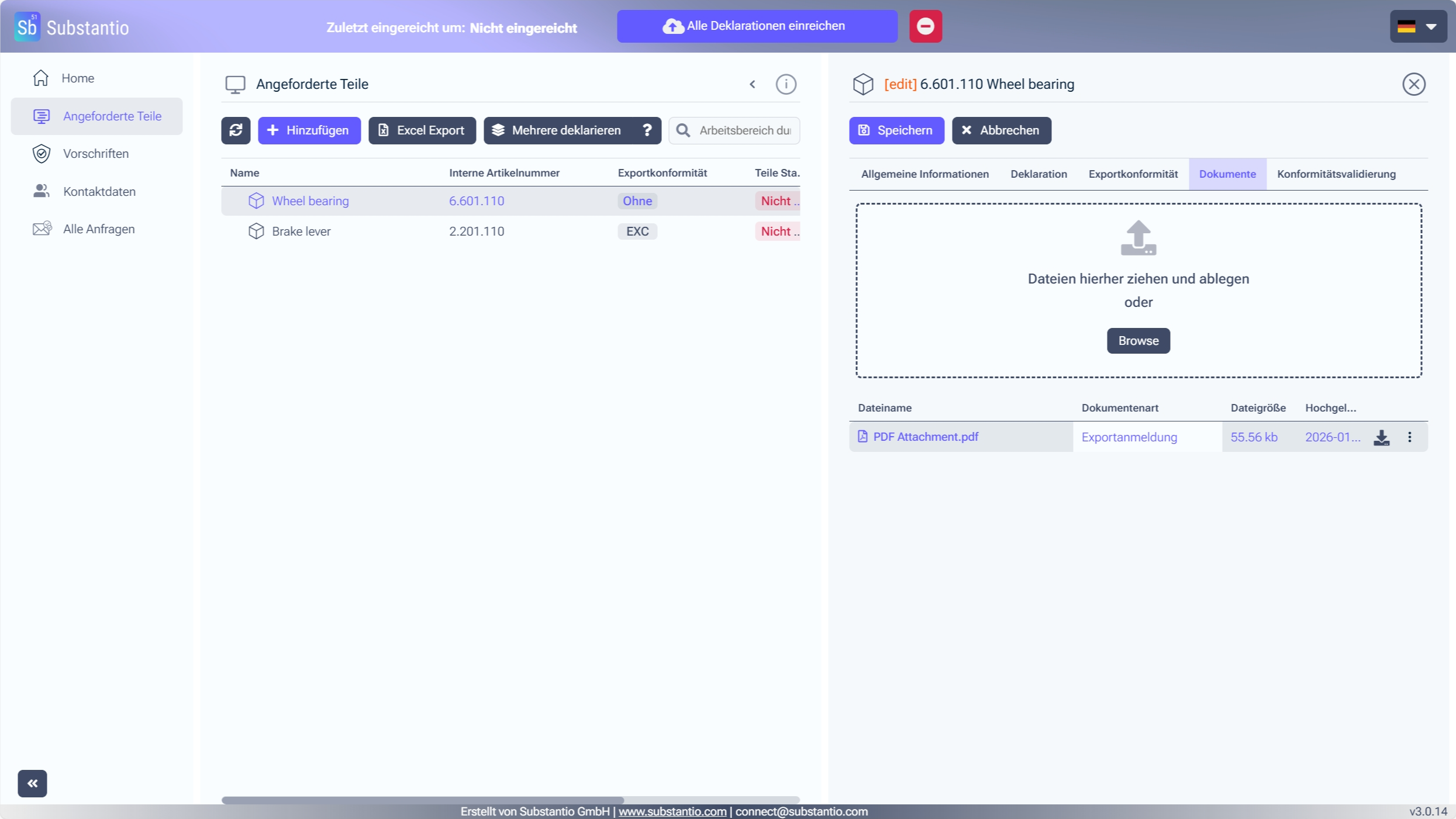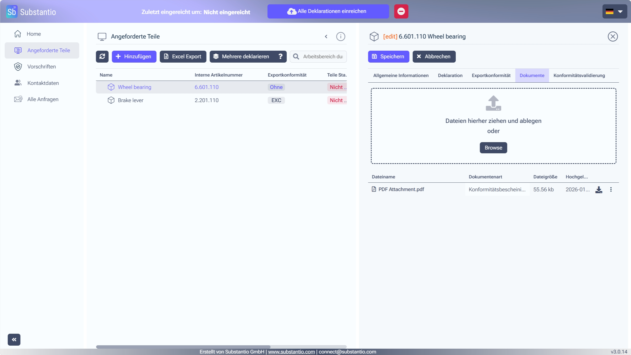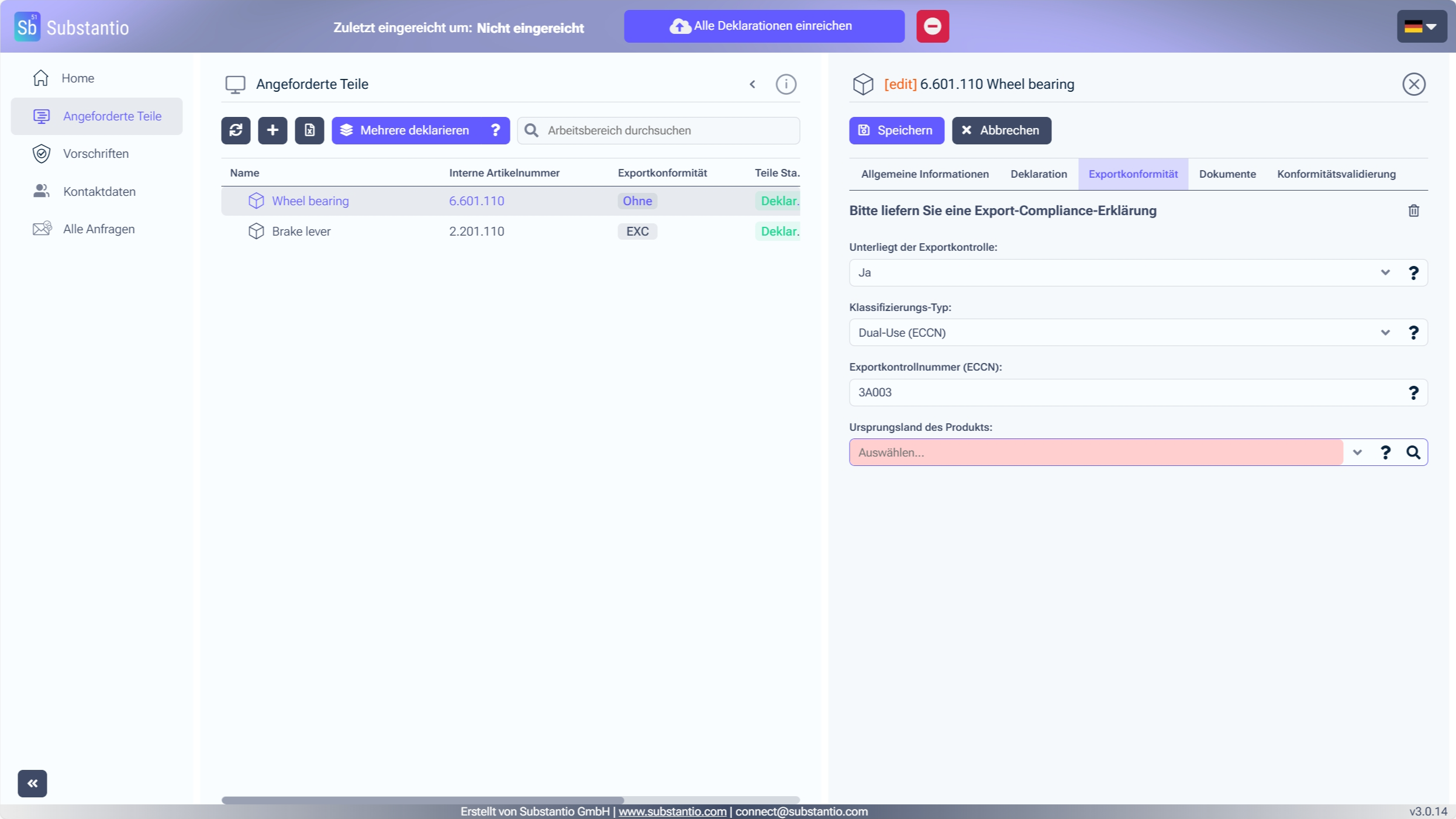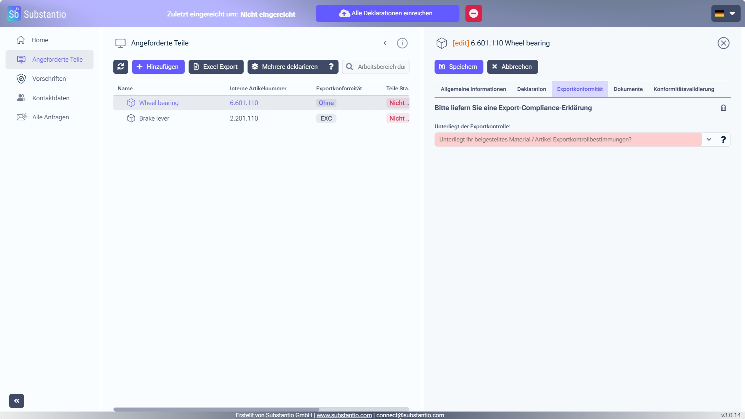 Über den Link in der E-Mail Ihres Kunden gelangen Sie zur Substantio-Plattform. Um die Anfragen Ihres Kunden zu bearbeiten, klicken Sie auf Jetzt deklarieren.
