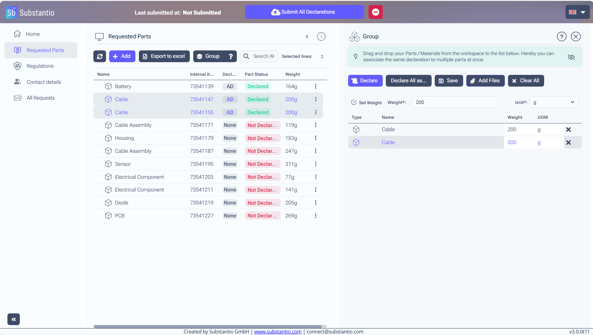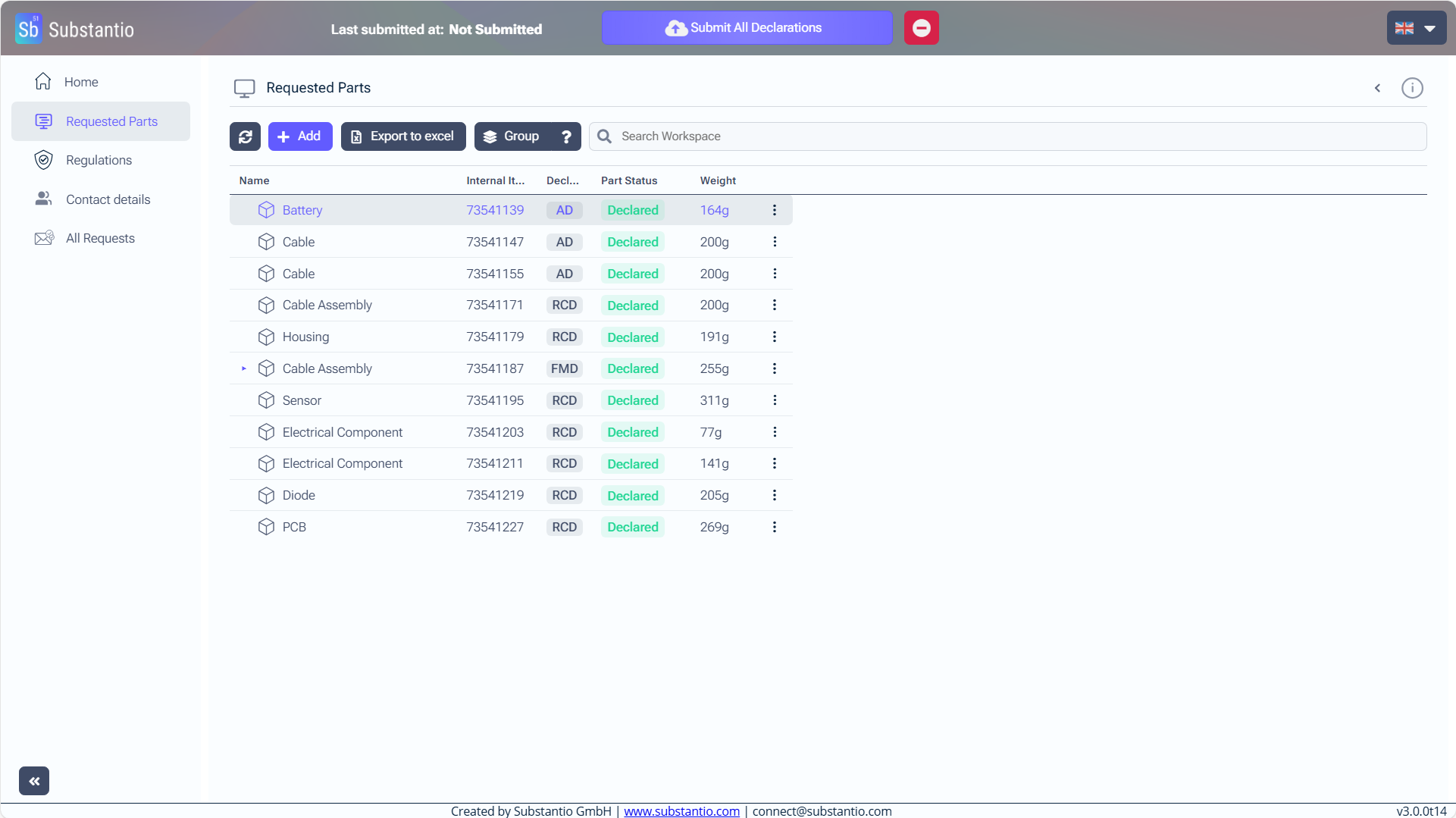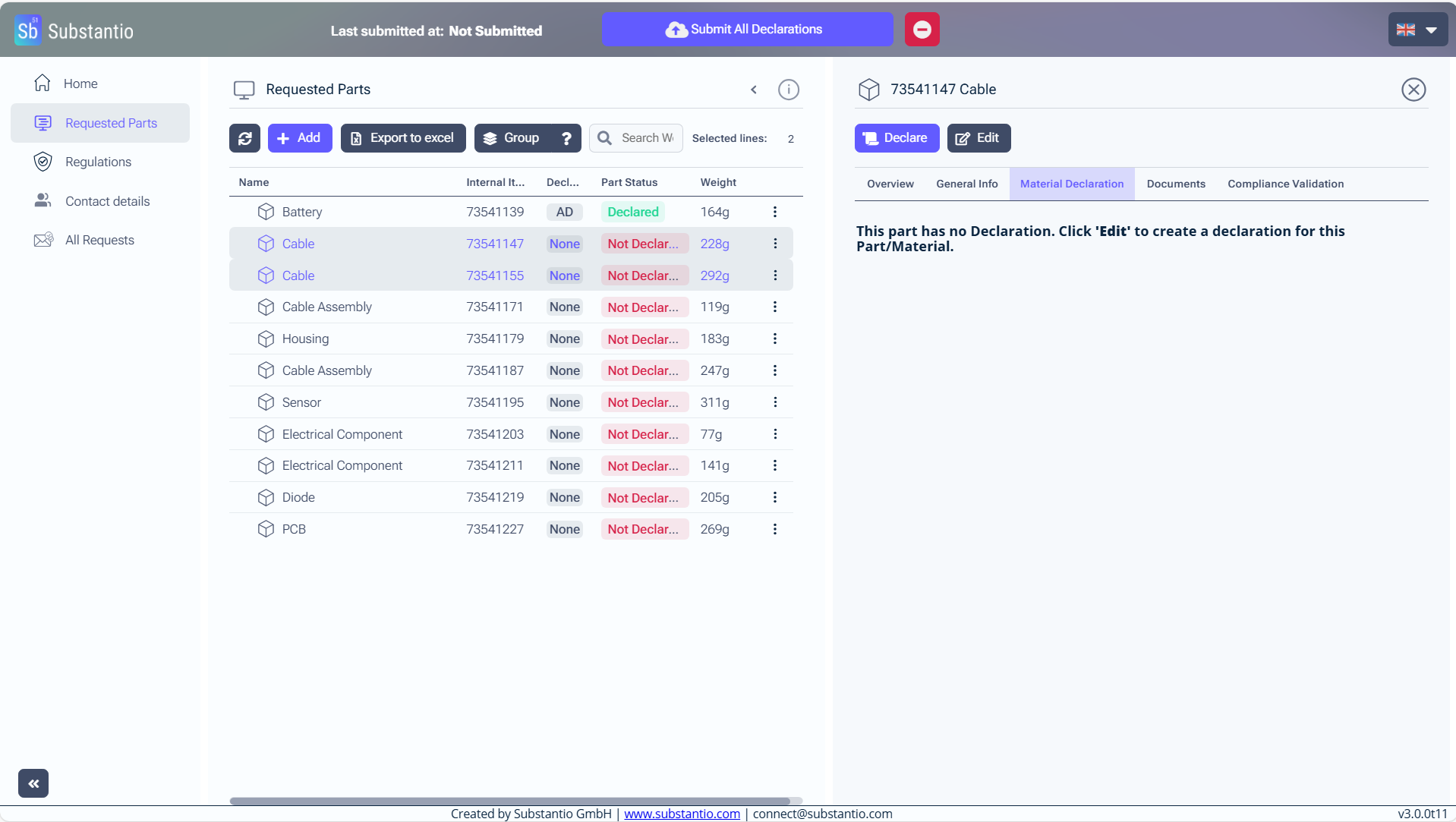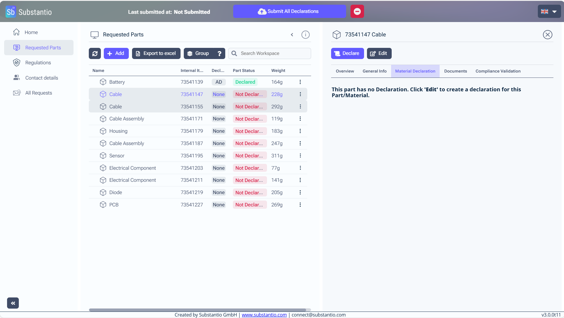 You accessed the Substantio platform via the link of your customer's email for substance compliance. Respond to the requests from your customer by clicking the Declare now button.