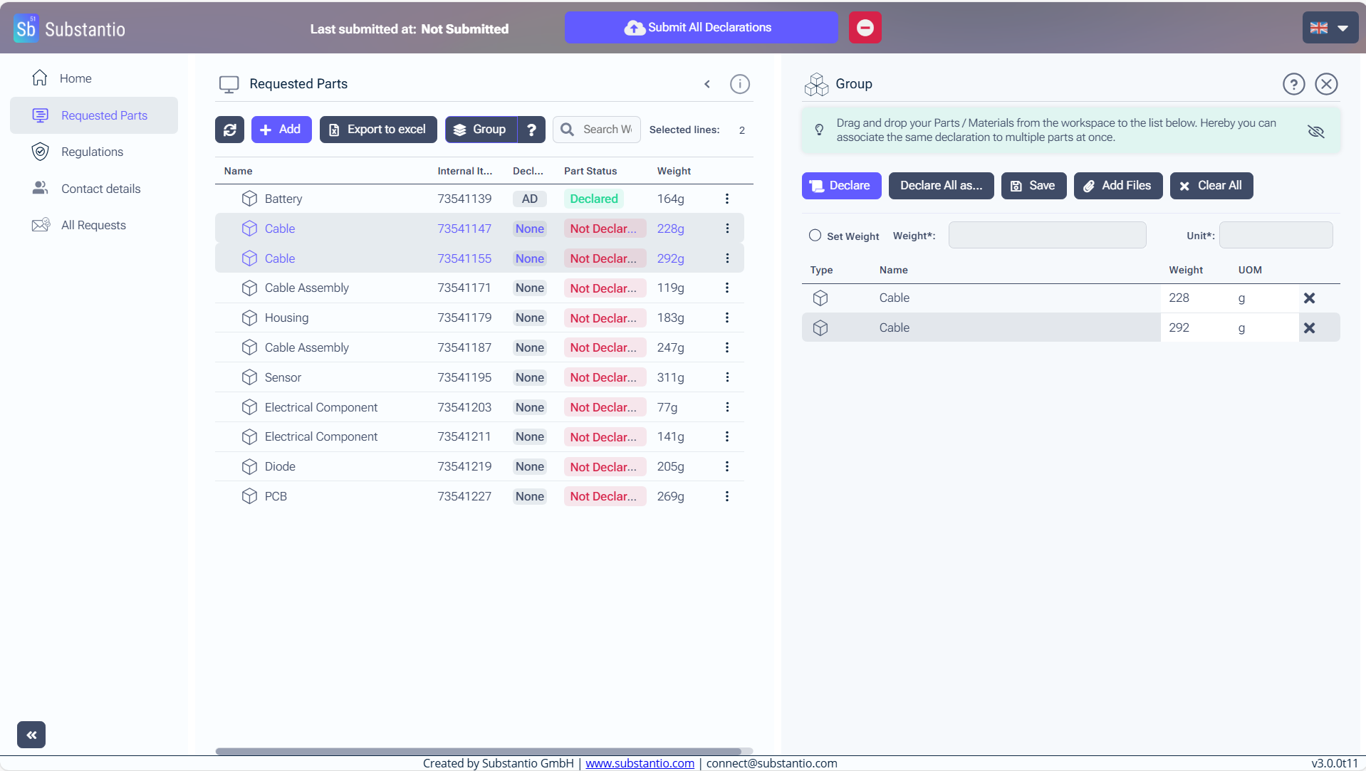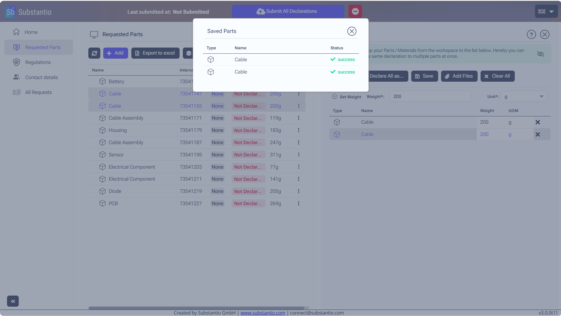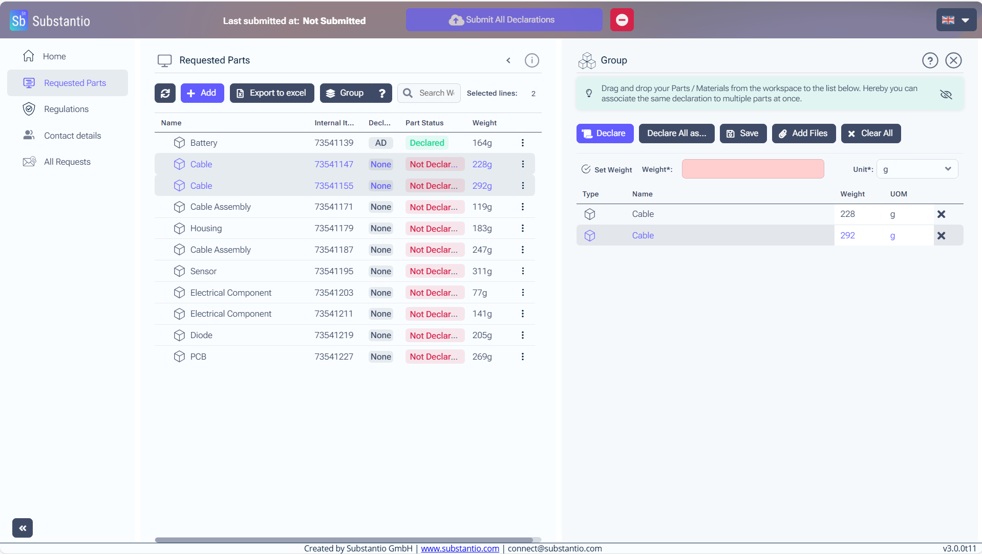 You accessed the Substantio platform via the link of your customer's email for substance compliance. Respond to the requests from your customer by clicking the Declare now button.