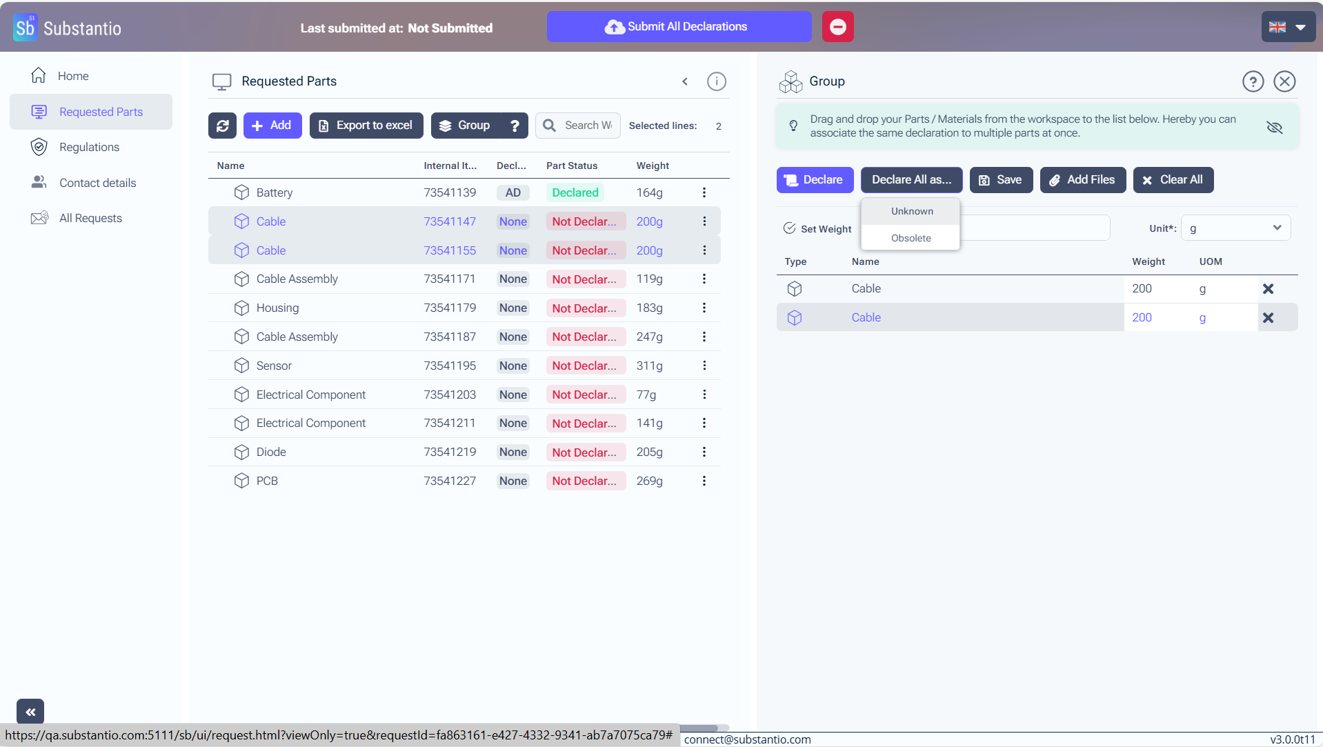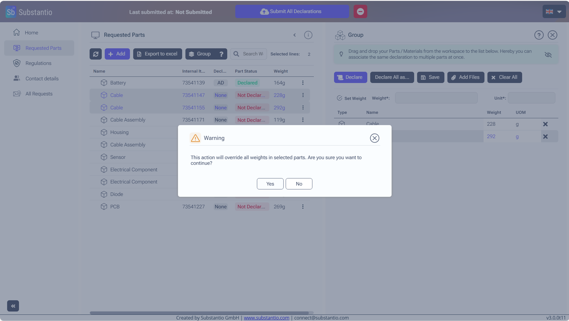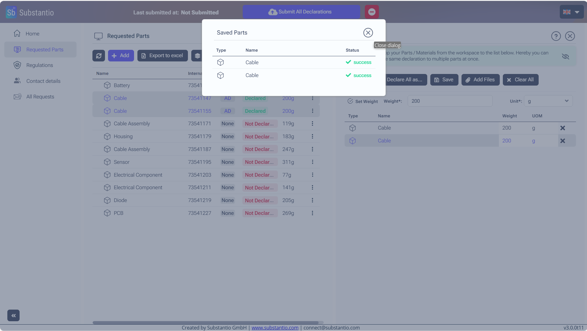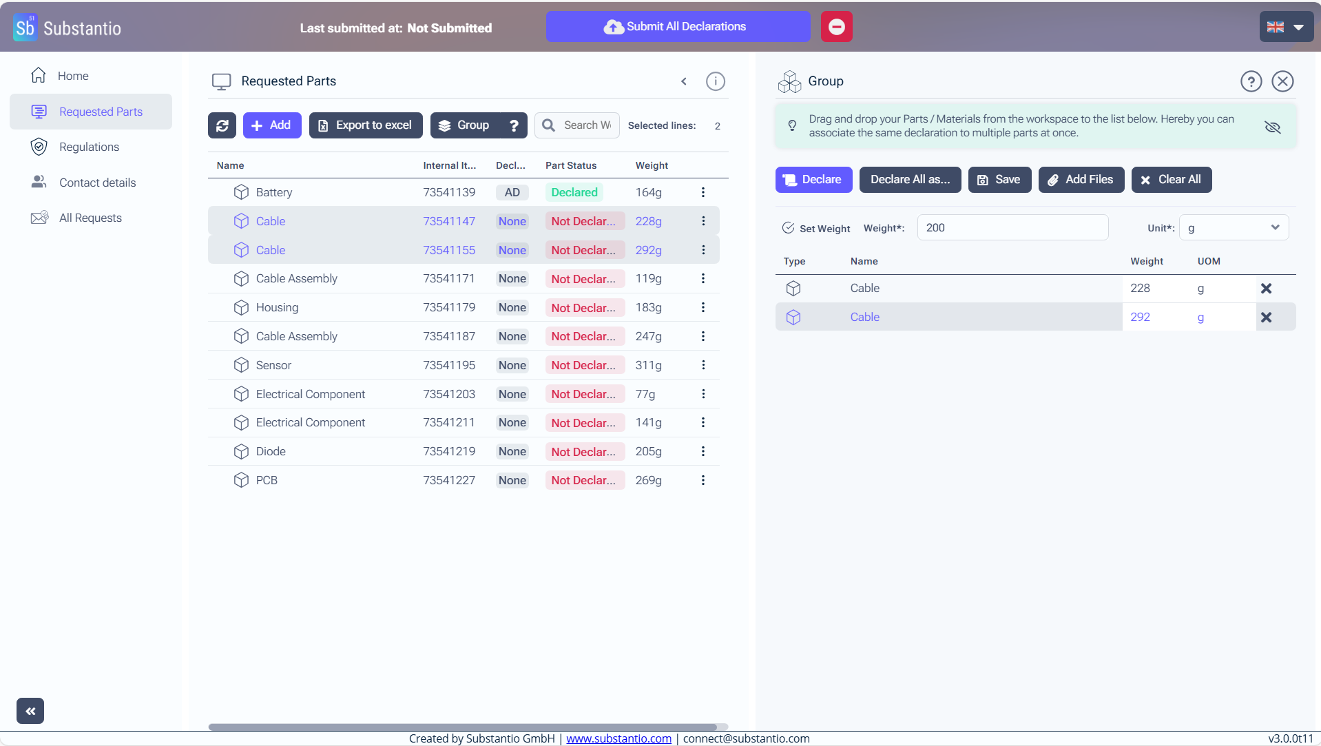 You accessed the Substantio platform via the link of your customer's email for substance compliance. Respond to the requests from your customer by clicking the Declare now button.