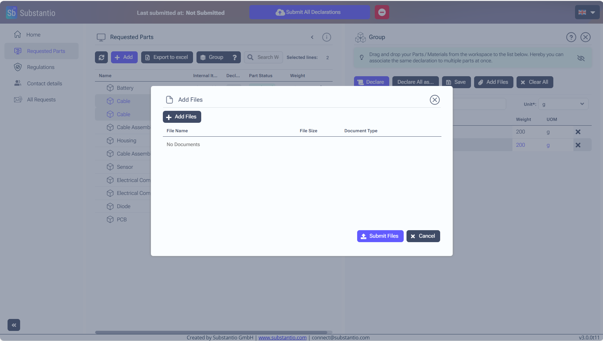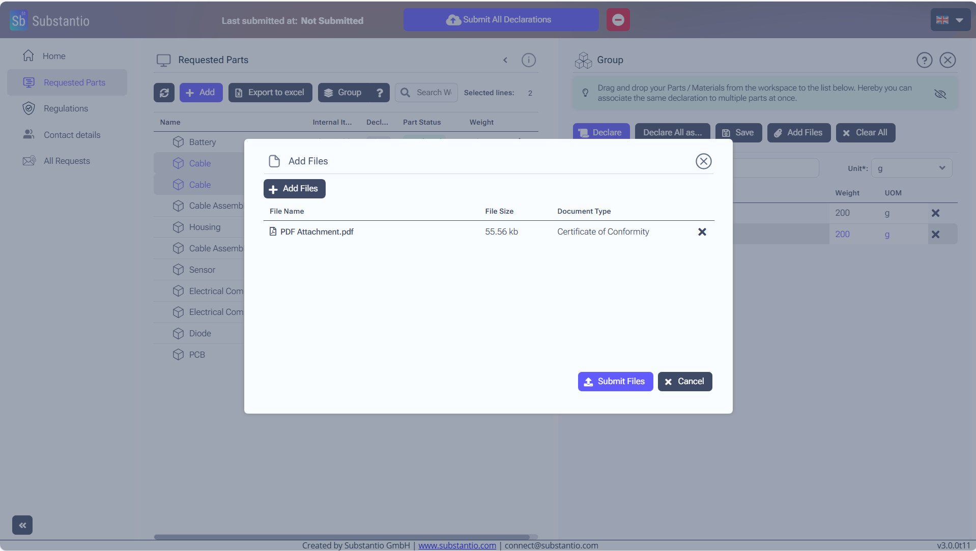 Please upload a conformity document to validate your declaration. To do this, click the Add Files button. You can upload multiple documents by clicking the Add Files button for each additional document and selecting the relevant file.